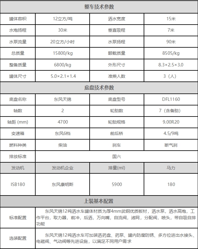 東風天錦12噸灑水車上裝配置: